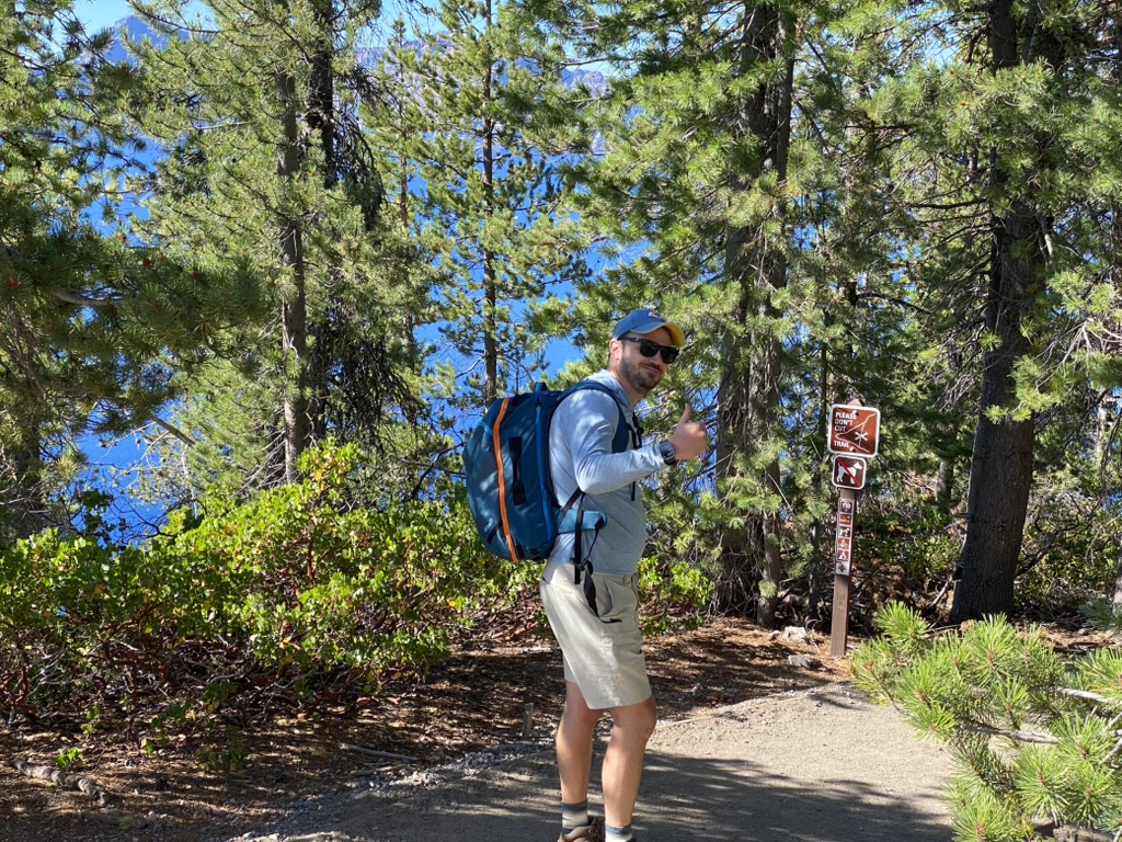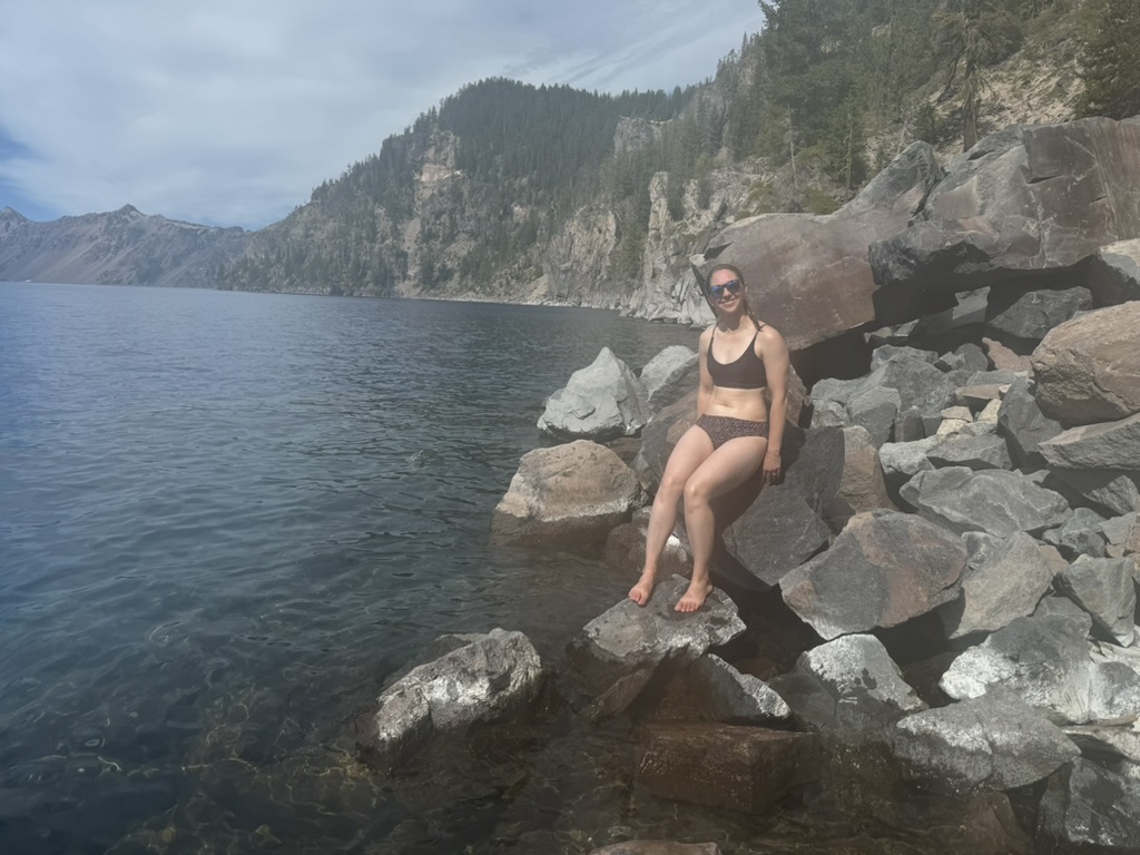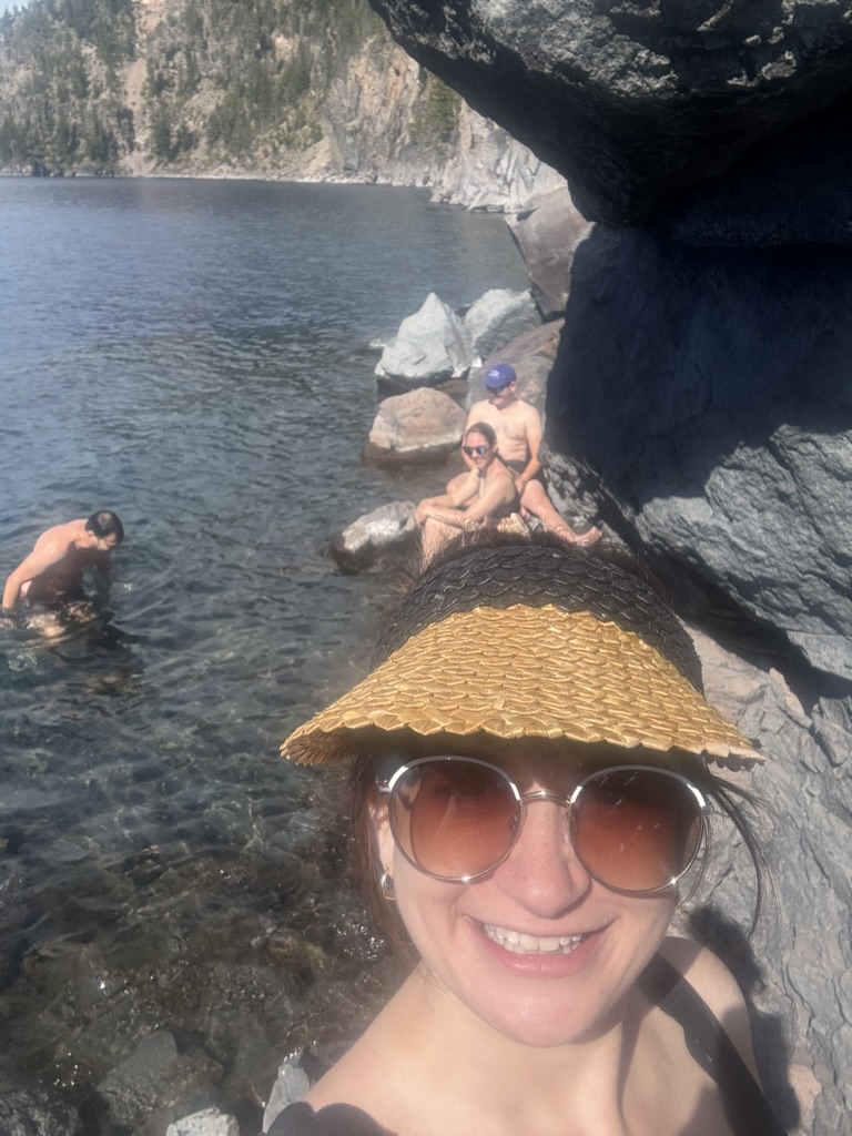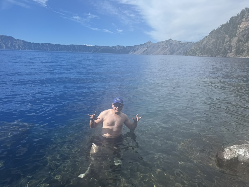 We met up with Ben & Hannah (whose wedding will be shortly after this trip!) and went down to the lake for a quick morning swim! The hike terminates at the boat dock where you can go on a tour around the lake (and even go to Wizard Island inside the lake), but the more important part was cooling down by jumping in the actual lake. Ben also saw the nice cliff close to the boat dock, so he convinced me to join him in a small cliff-jump. Happily, I can report we did not kill Ben before his big day – Hannah seemed pleased!