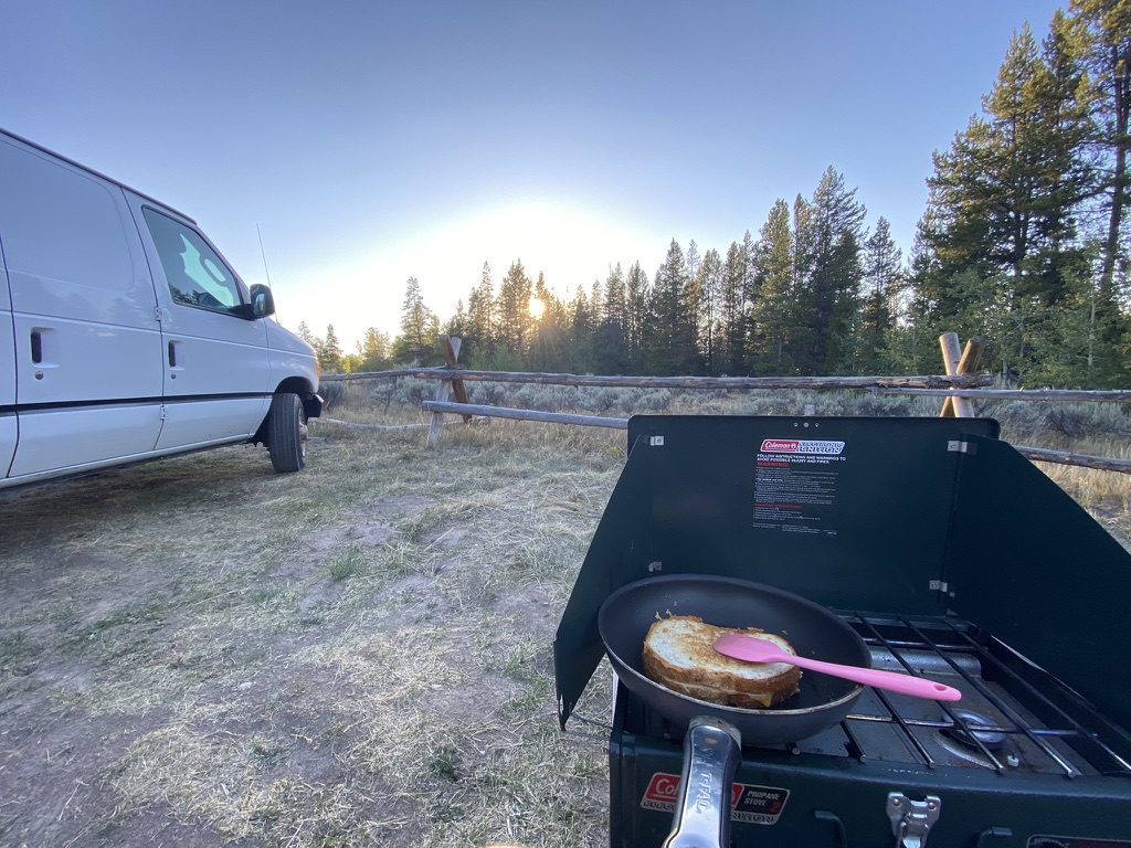 One notable part of this area was that we did NOT want to pay $60 for a tent campsite to just park our van, so we decided to try out some of the dispersed camping spots in the national forest next door. This was a pretty well maintained area for free car/RV camping, and the views were phenomenal in some of the locations – given how late we arrived, our location was not as prime as it could be, but a grilled cheese looks good wherever you cook it.