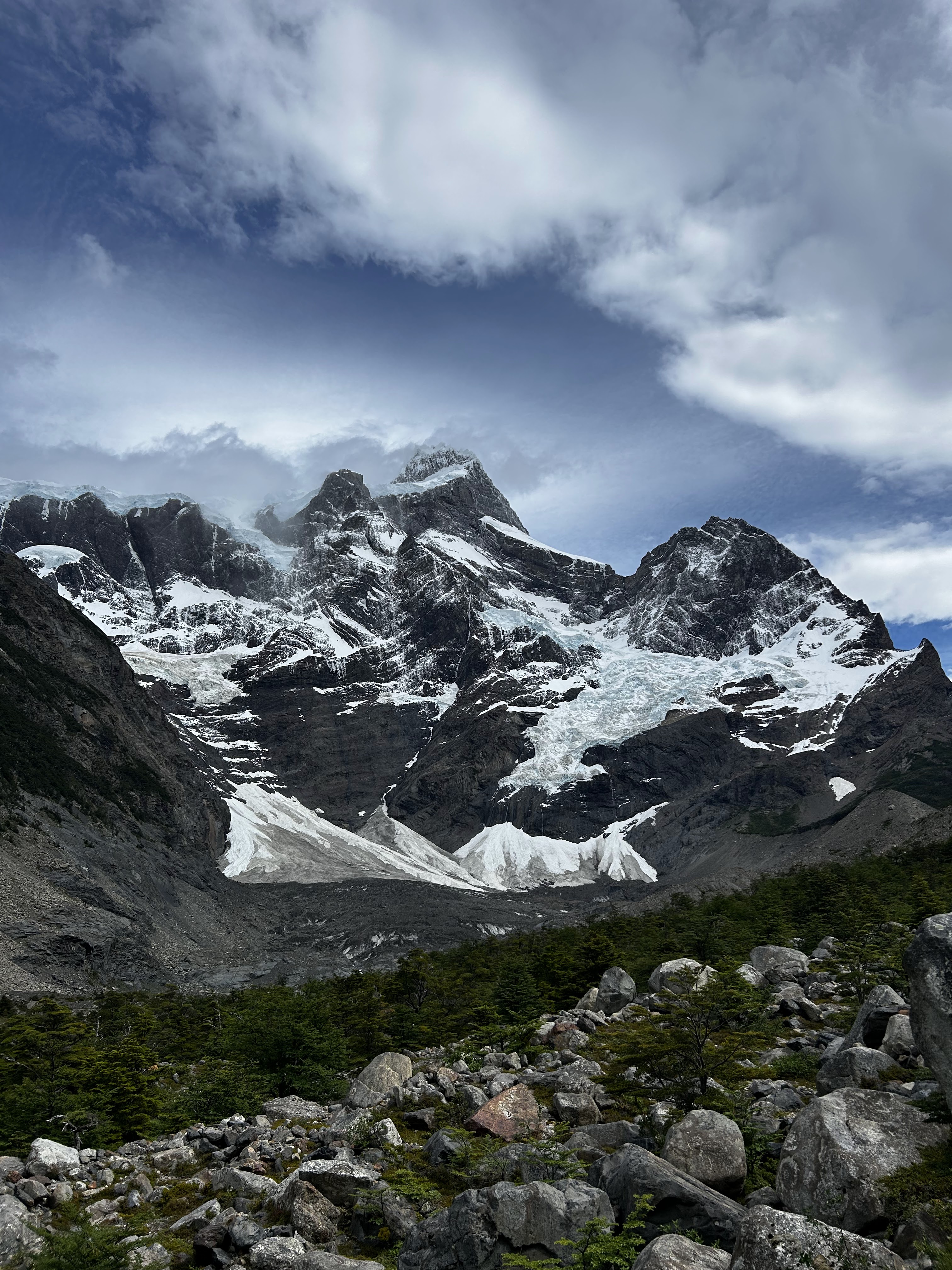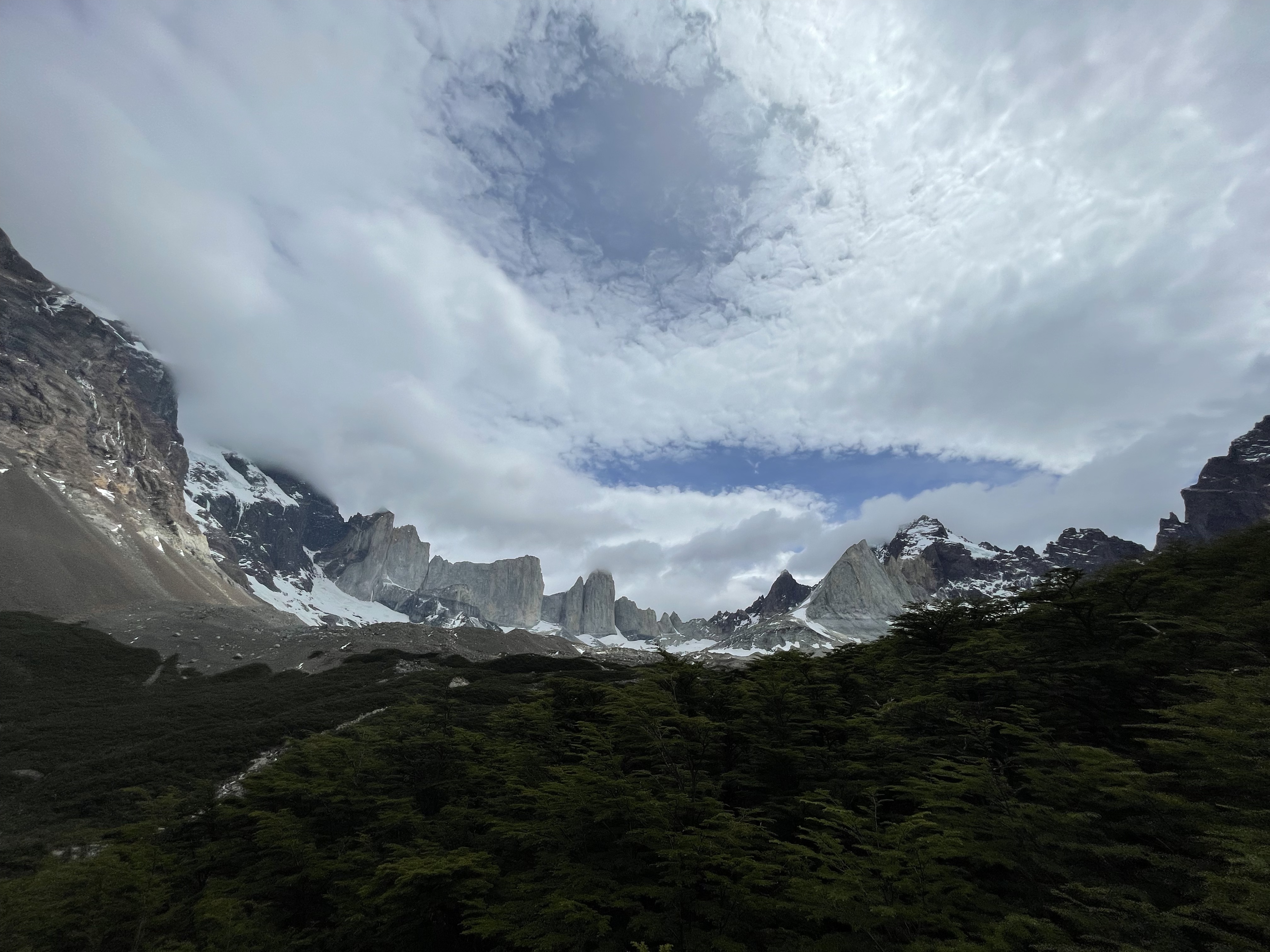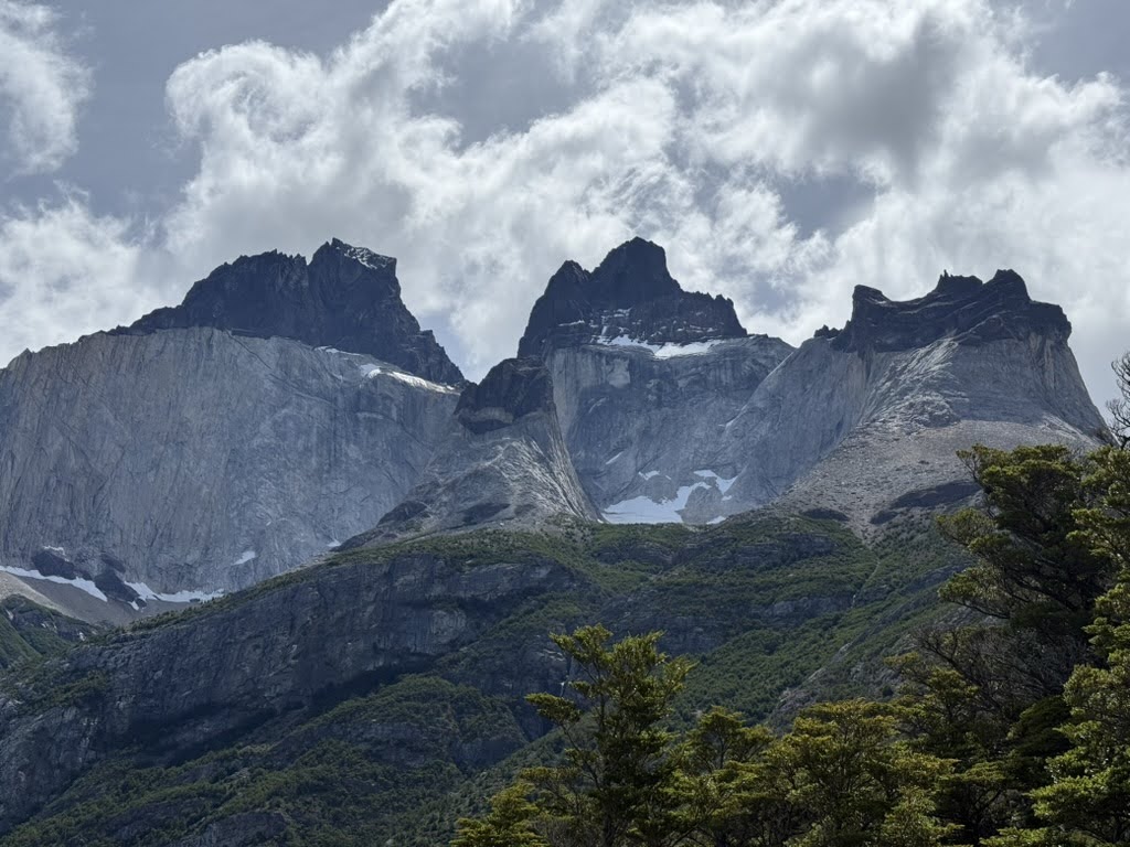 Hiking to the French and British viewpoints along the way was quite a surreal experience – whenever we had the chance to look away from our feet as we scrambled on top of loose granite blocks, we’d marvel at the massive snow-covered slopes seemingly a few hundred feet away. Every now and again, a massive boom would ring out and we’d see a small (relative to the entire snow-covered area) amount of snow falling off a small edge of Paine Grande Mountain. This hike, while exhausting, was a fantastic experience that has us end in a small forest at the base of a mountain range encompassing almost the entire panoramic view.