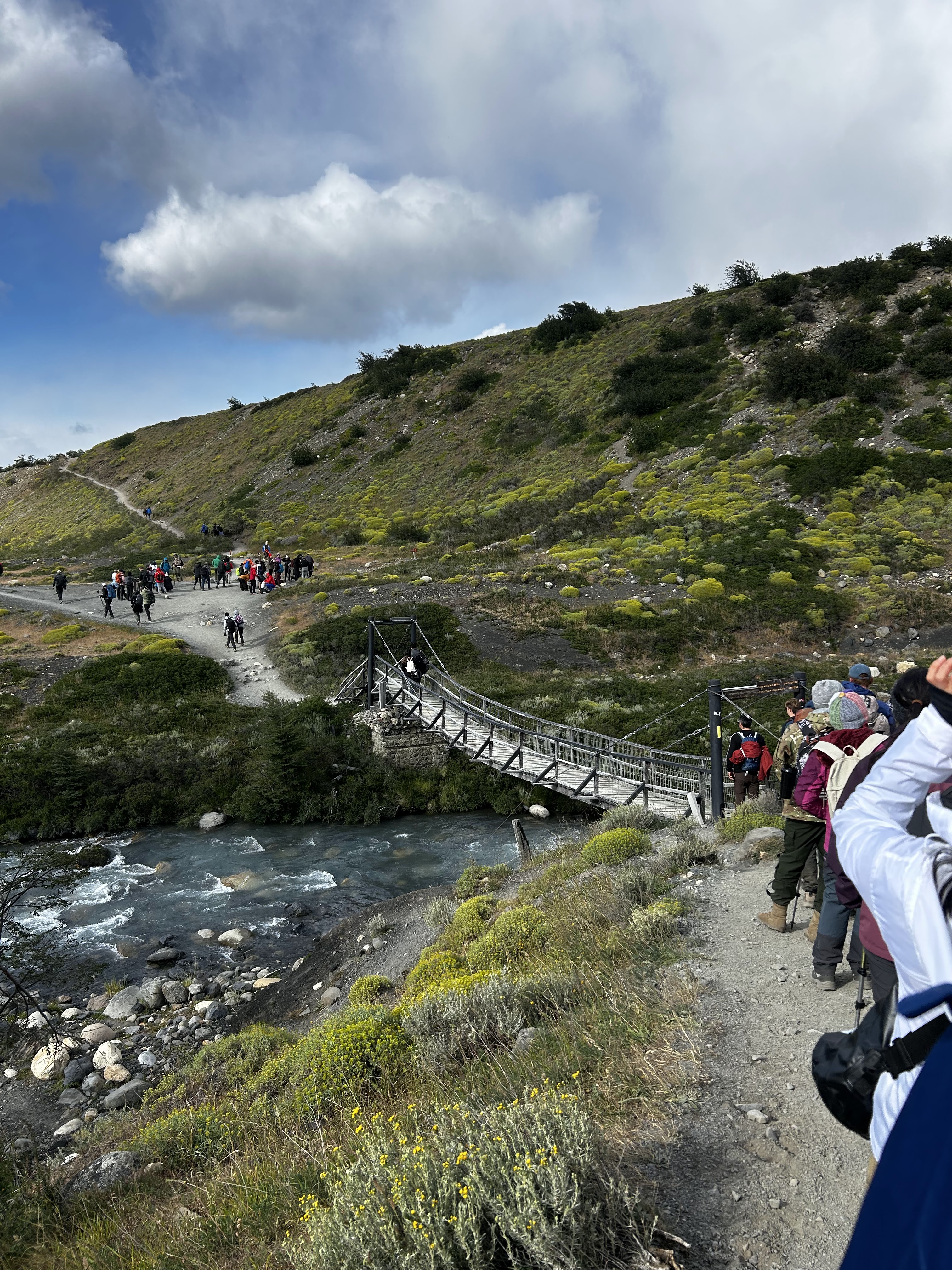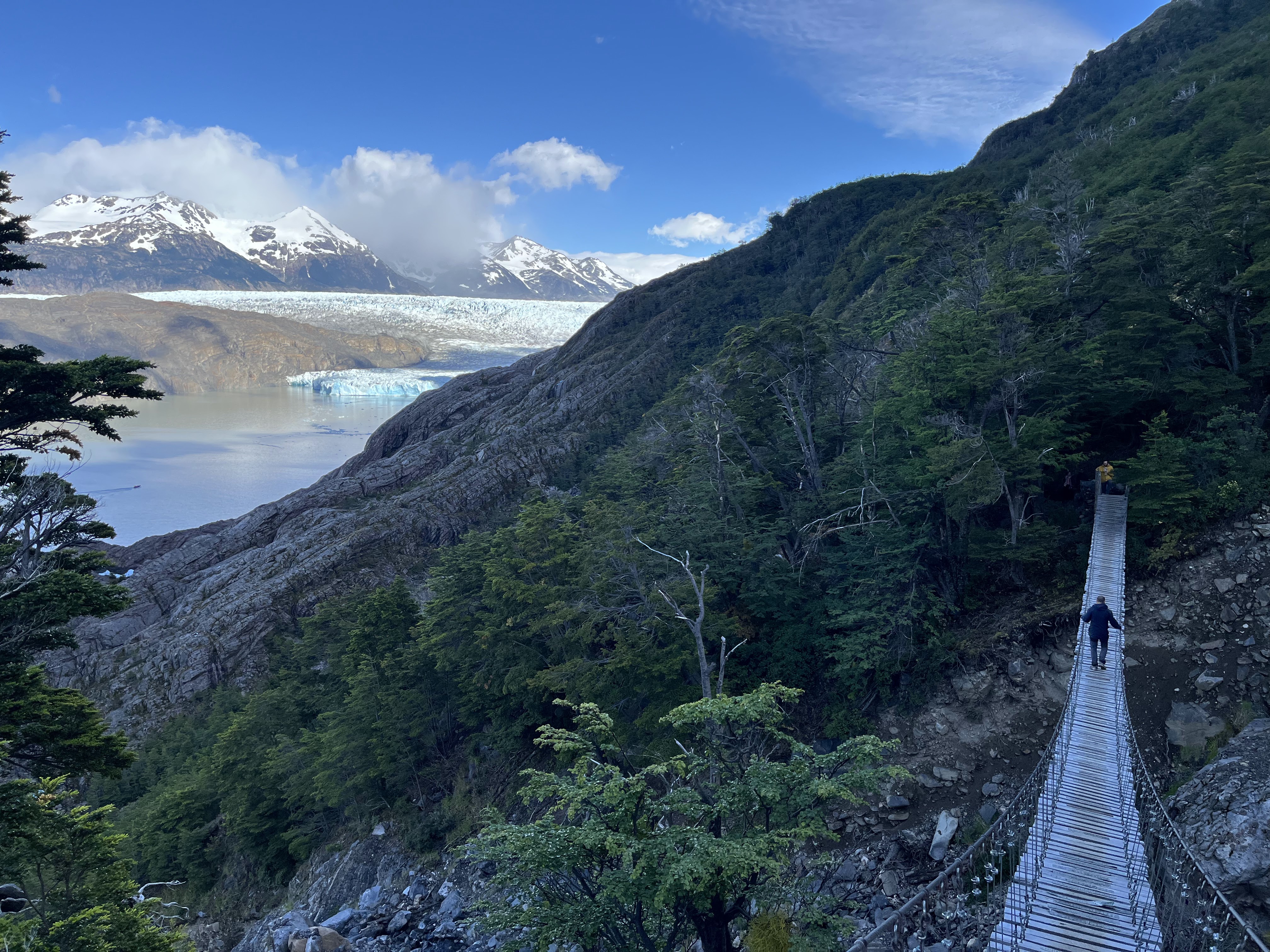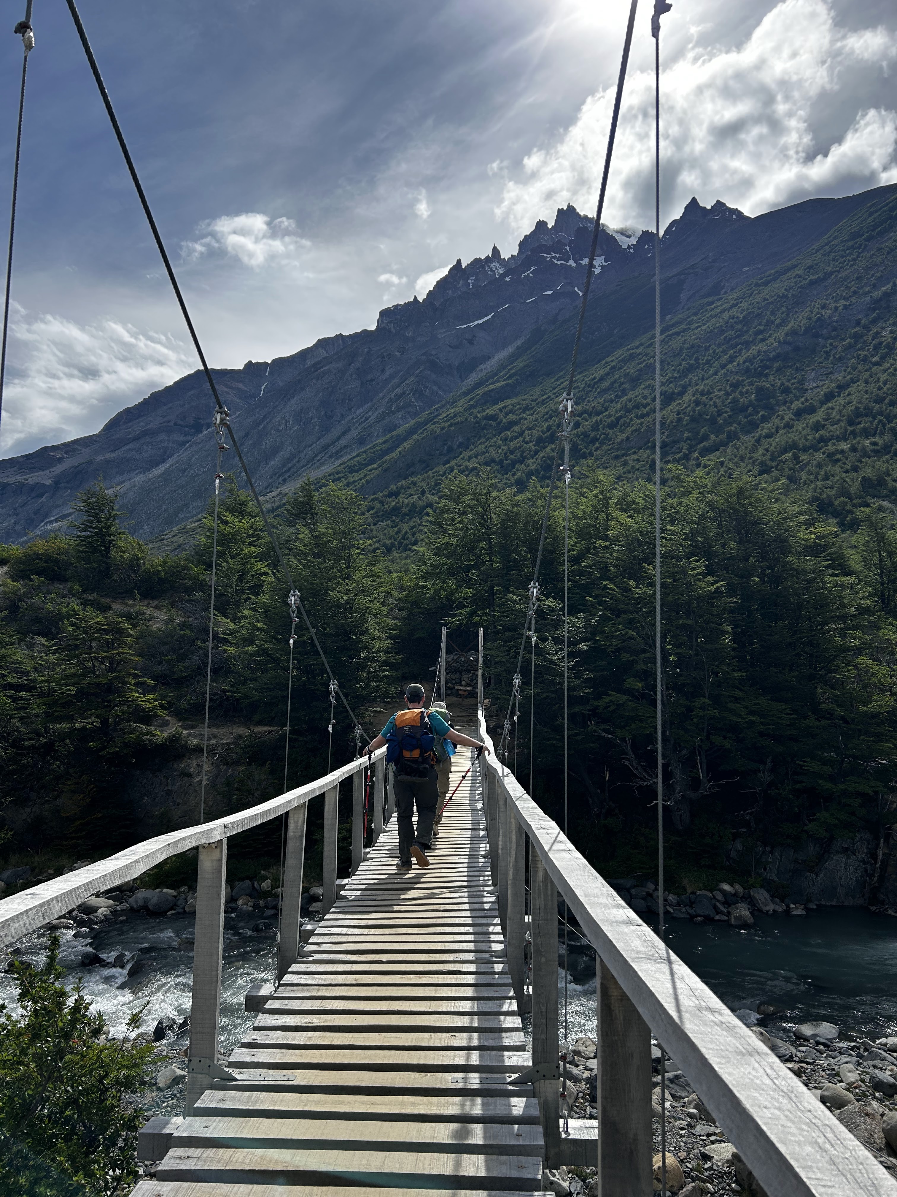 We woke up on day 5 a little less rested than the prior nights, but I’m sure the guy snoring loud enough to wake up all 40 tents got his good night’s sleep! Thankfully overnight the weather decided to improve a good bit and we were no longer going to be soaked the entire hike. Our first stop was the hanging bridges on the way to Grey Glacier – these are wooden bridges (with reinforced steel cables to be fair…) that span some of the rivers that drain into Lago Grey and to say that crossing them is a bit daunting is… quite an understatement. But maybe that’s just my fear of heights kicking in…