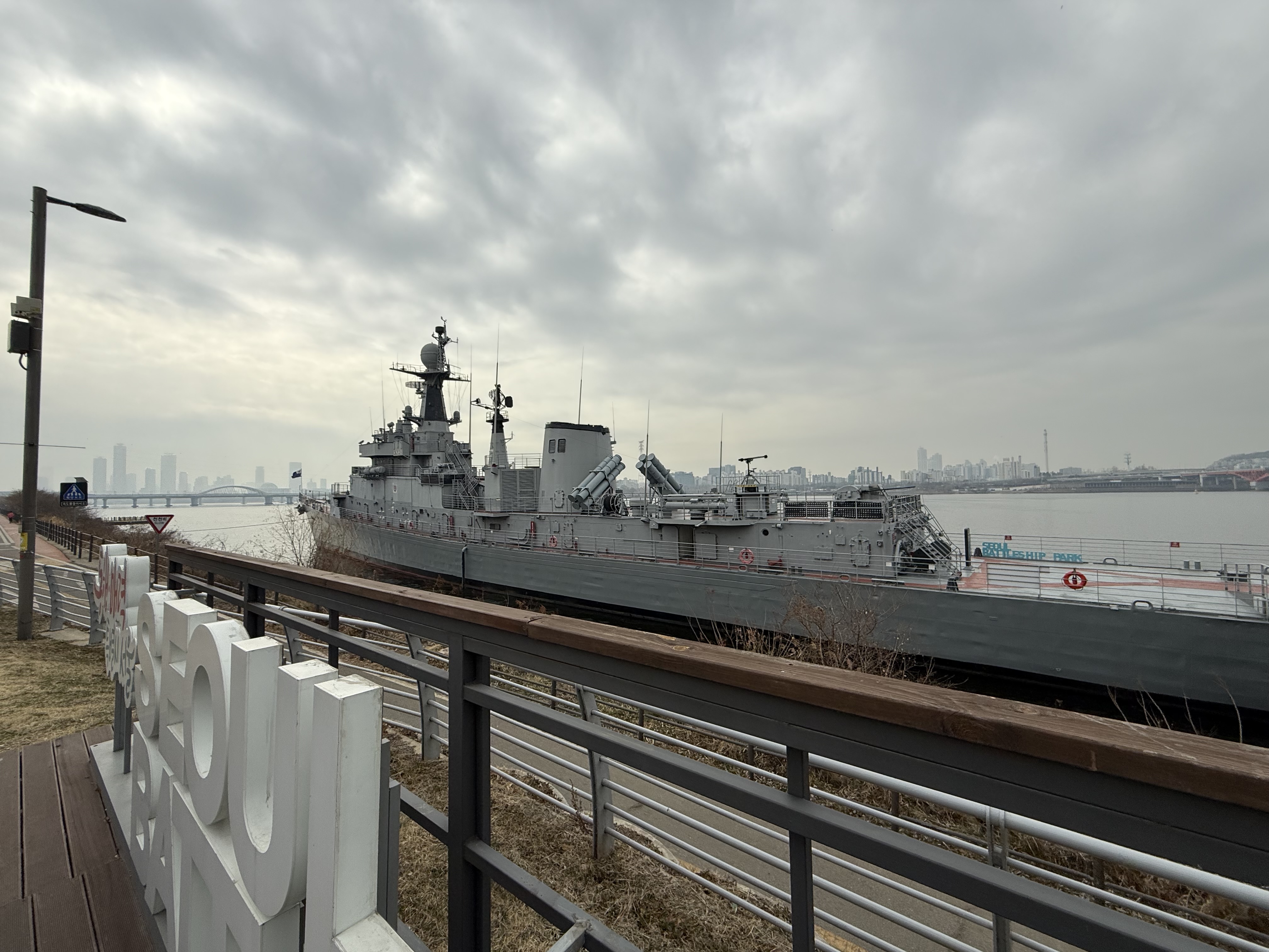 Brand hunting aside, we did manage to ambulate to the World Cup Park near the stadium built for the 2002 World Cup in Korea. This is a super cool park that was literally built on top of a landfill – even walking around you’re constantly reminded of it’s history due to the methane control system reminding you not to smoke near pipes full of flammable gasses built up in the remaining trash under the park… The history of the park was super interesting and it was a nice place to take a cute picture before walking along the Han river which bisects Seoul and seeing some wonderful navy ships. Like I said – weird day… For the rest of this strange touristic start to our Korean adventure, we mostly wandered around Hongdae street (a well known tourist trap area, but still filled with great food choices) before ultimately retreating to our Airbnb for an early night. The view from the apartment was pretty deluxe – I don’t really remember it all that much given how tired we were, so it’s nice to take a look at it again in the photos below!
